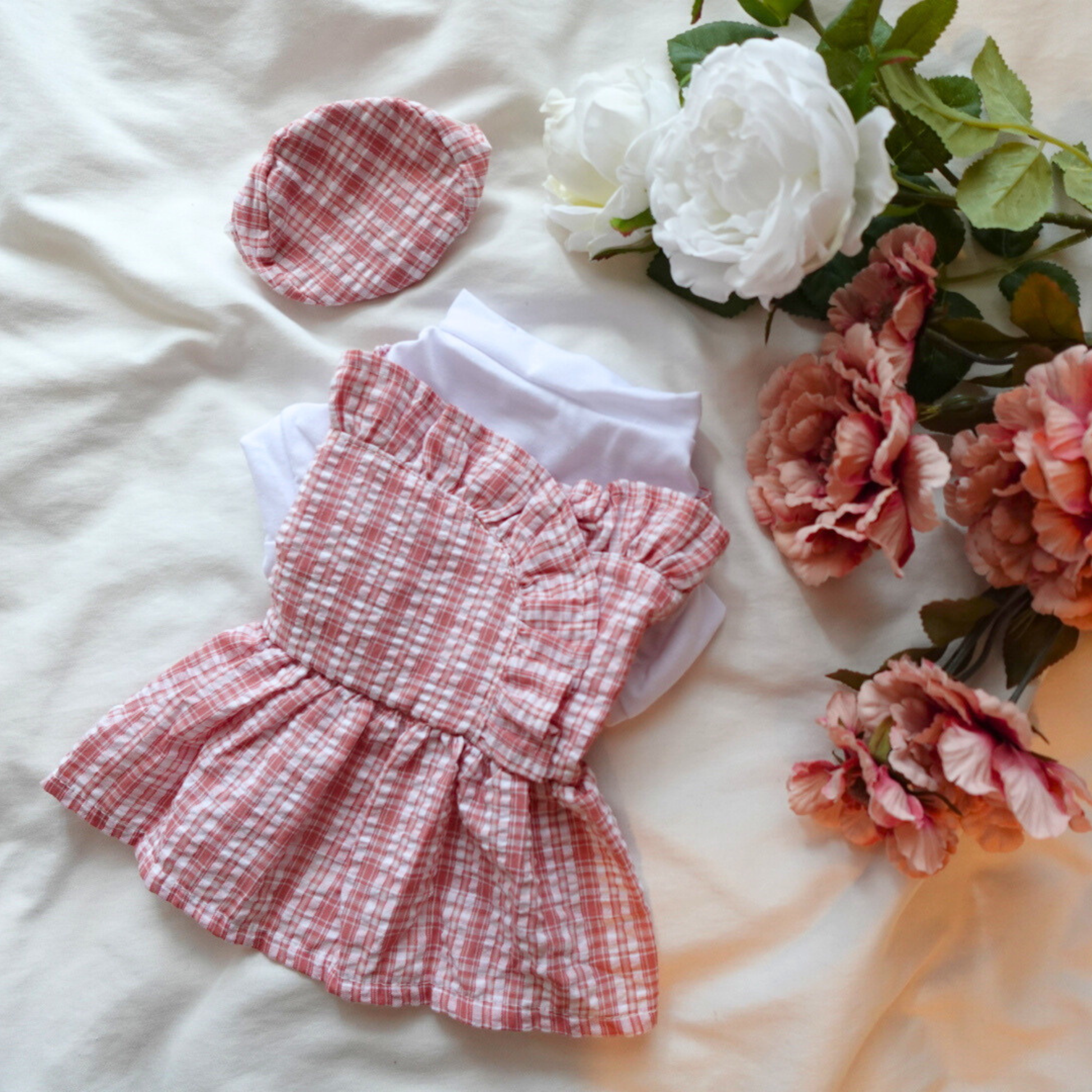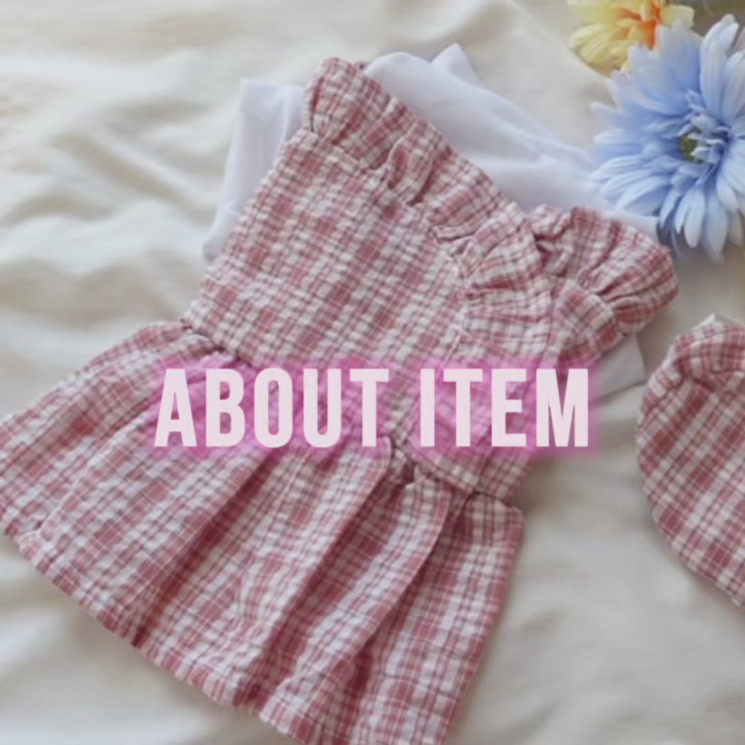 犬服 小型犬|ギンガムチェック トップス付きワンピース(ミニ帽子付き)