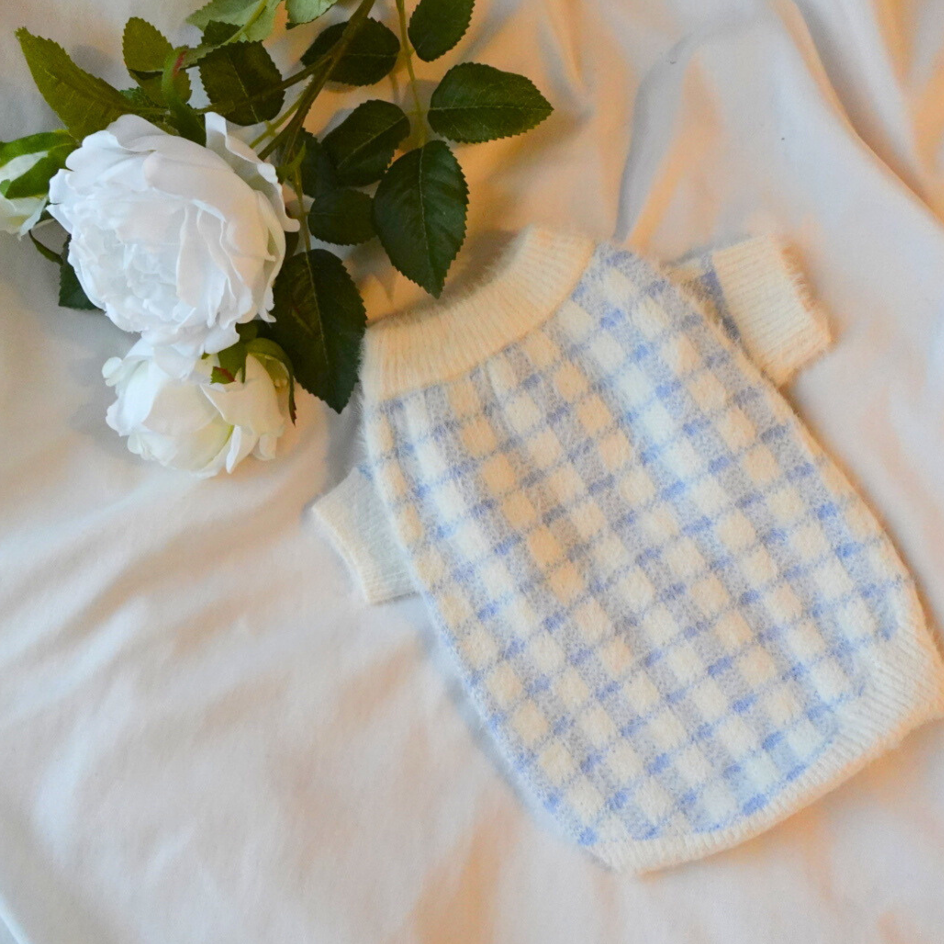 犬服 小型犬|ギンガムチェック ニットカーディガン(ブルー)